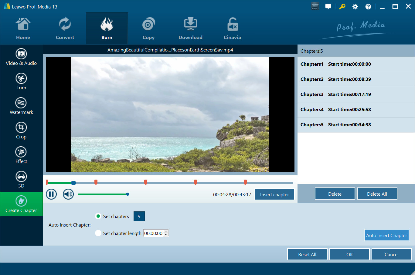 进入“章节”部分。您可以在想要创建章节的时间点单击“插入章节”按钮来手动添加章节,也可以在单击“自动插入章节”按钮之前输入“设置章节”按钮或“设置章节长度”按钮的数量来自动添加章节。