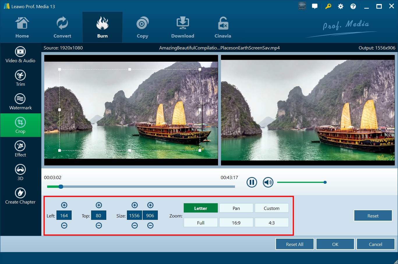 在“裁剪”按钮下,直接拖动点框即可裁剪视频,或在“缩放”中选择“Letter/Pan/Custom/Full/16:9/4:3”,然后调整“Left”/“Top”/“Size”中的值以获得所需的视频大小。按“OK”确认。