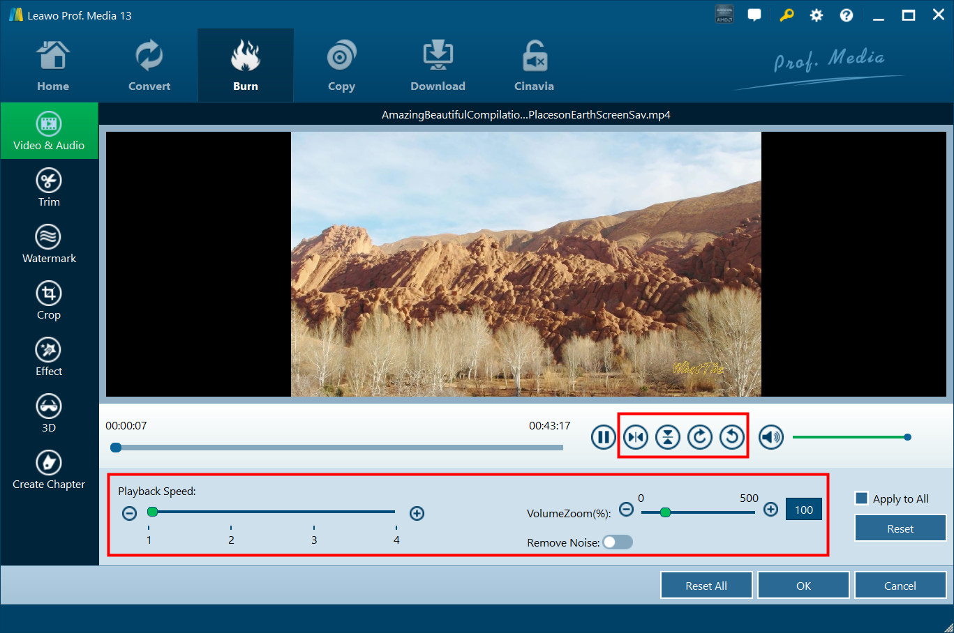 在“视频和音频”部分,您可以调整播放速度到最高 4 倍输出,勾选“消除噪音”,调整视频音量缩放,以及水平翻转、垂直翻转、顺时针 90 度或逆时针 90 度旋转视频。