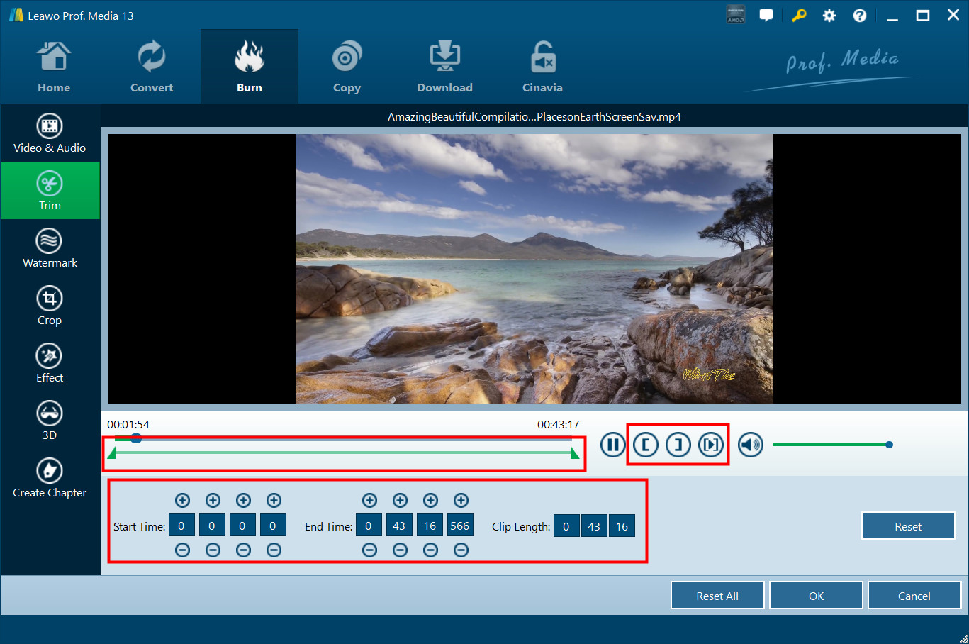 在“修剪”部分下,您可以直接拖动滑动条来修剪视频长度,或者在“开始时间”和“结束时间”框中手动输入值。可以立即查看剪辑长度。重置它或单击“确定”进行确认。