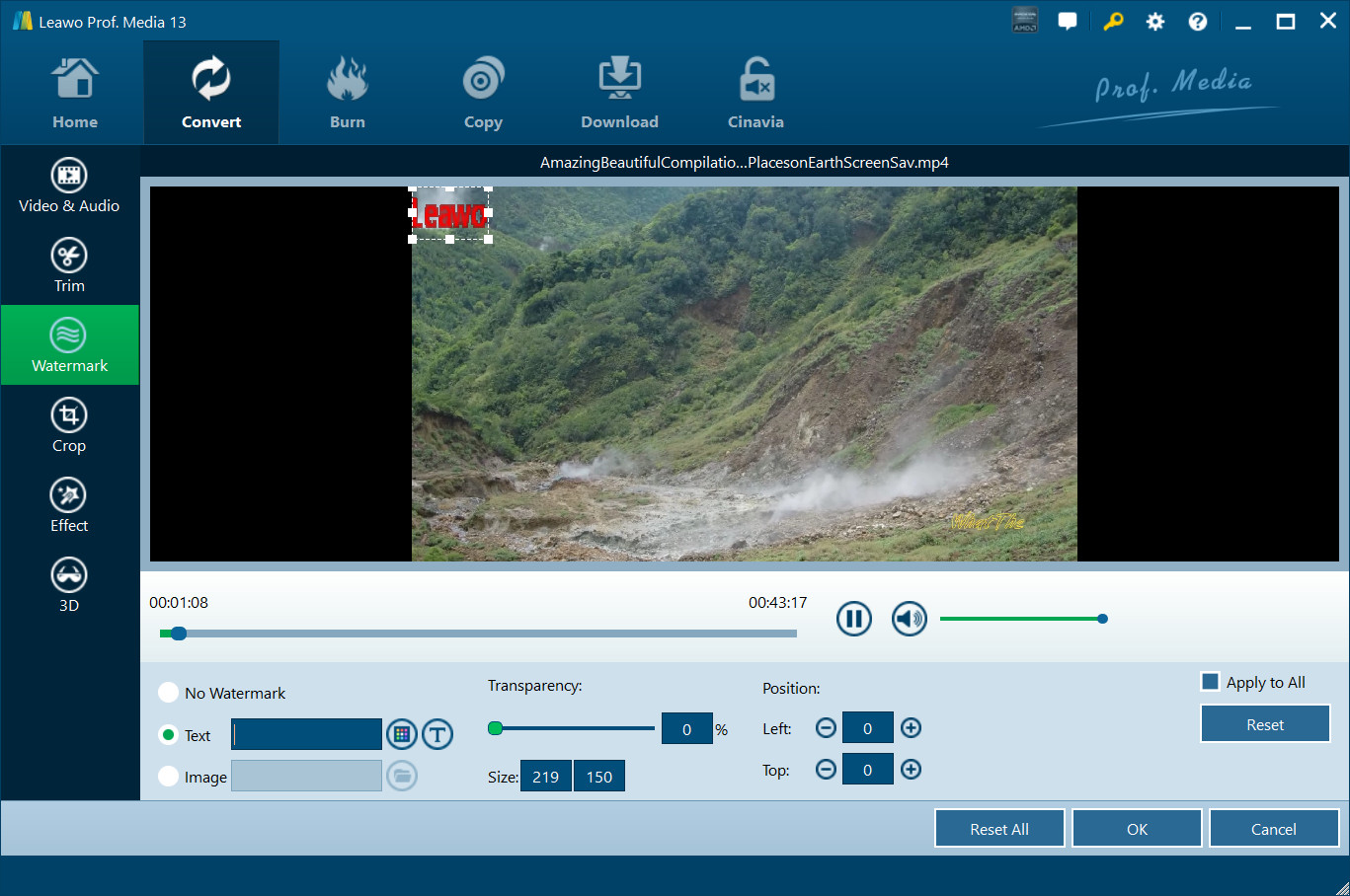 切换到“水印”部分,将水印按钮启用为绿色,然后您可以添加文本或图像作为视频水印。水印透明度、左边距、上边距、图像大小均可调整。勾选“全部应用“为所有视频添加水印。按”OK”来确认这一点。