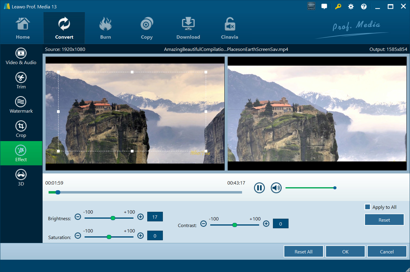 转到“效果”部分,直接将幻灯片拖到 “亮度”、“对比度”、“饱和度” 以获得特殊视频效果。检查 “全部应用” 将效果设置应用于任何已加载的文件。按 “好” 确认一下。