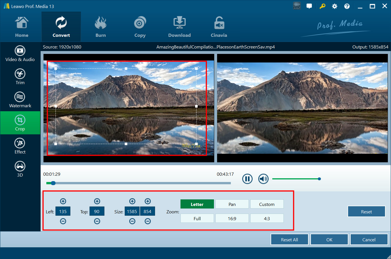 在“裁剪”部分下,直接拖动点框来裁剪视频,或者在“通过Zoom”,并在“中调整数值”左”/“上”/“尺寸“获取所需的视频大小。按”OK”来确认这一点。