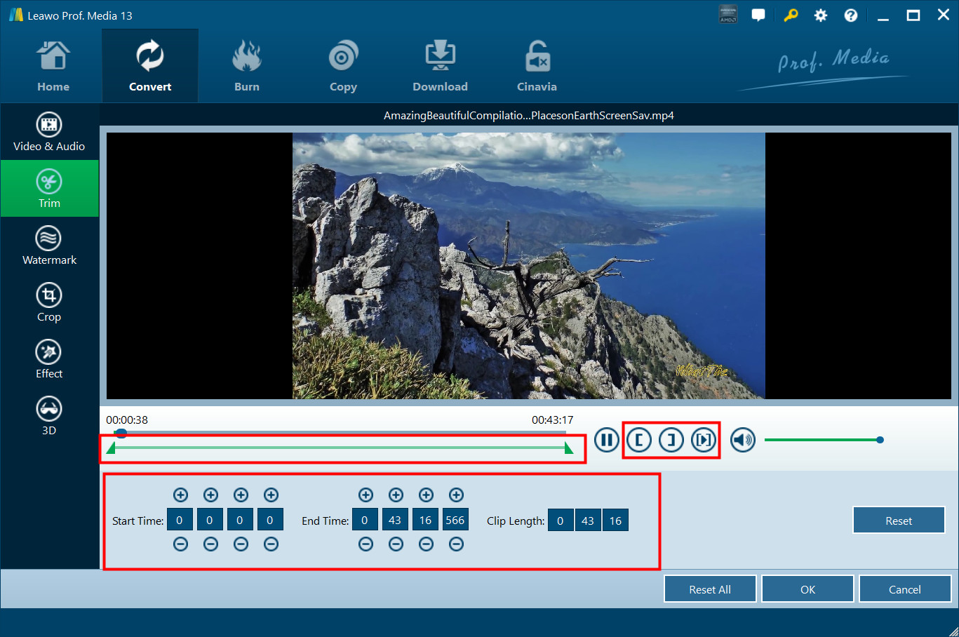 在“修剪”部分下,您可以直接拖动滑动条来修剪视频长度,或者在“开始时间“而 “结束时间”框。可以立即查看剪辑长度. 重置或点击“OK“确认一下